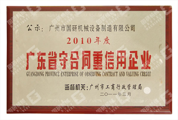 2011年4月,繼連續三年被評為“廣州市守合同重信用企業”之后,國研機械再獲殊榮,被評為2010年度“廣東省守合同重信用企業”。